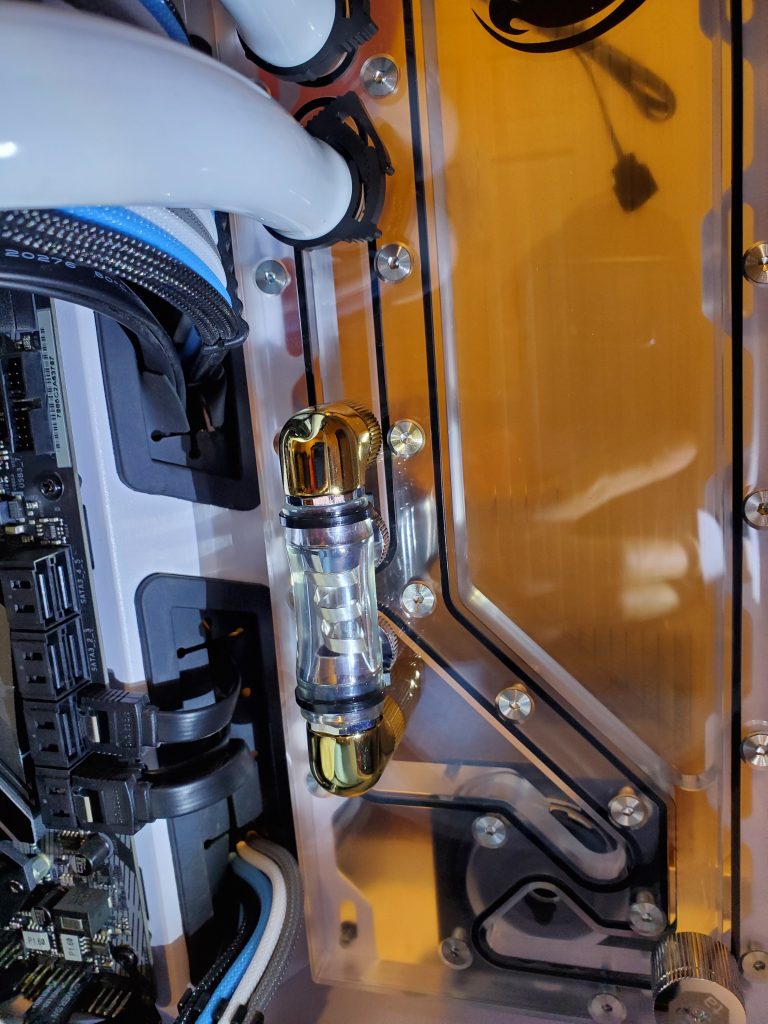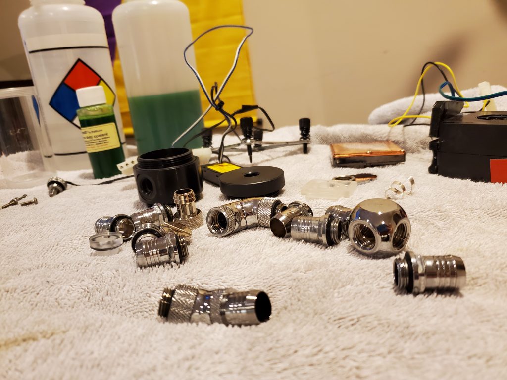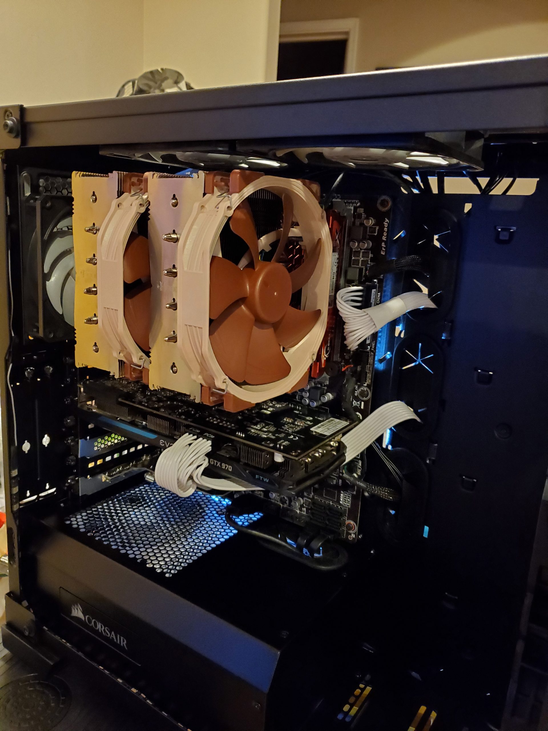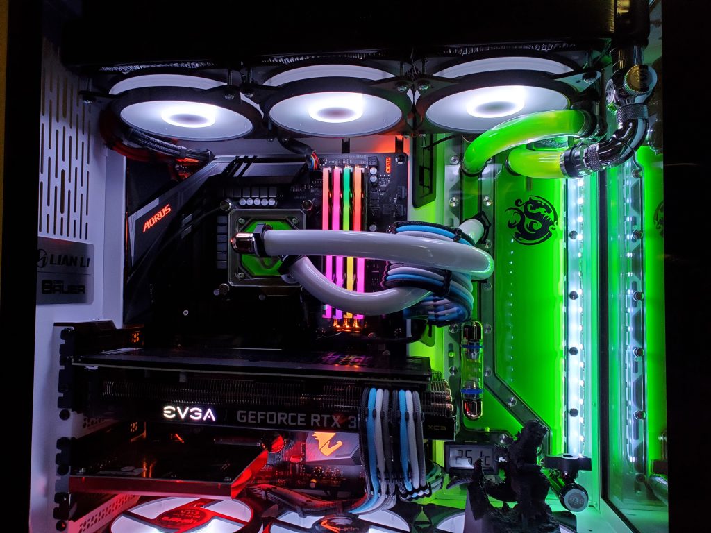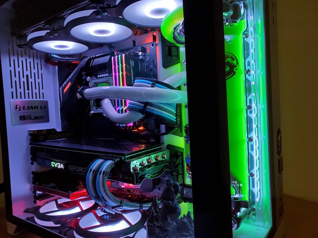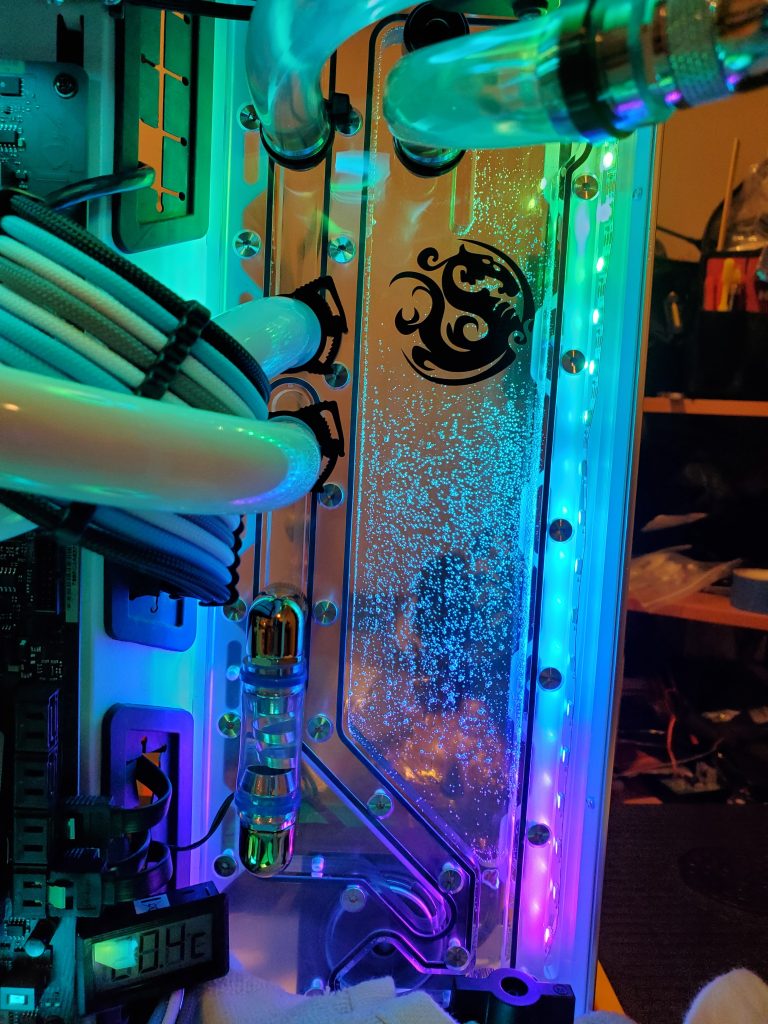 Custom loop with 1″ tubing. Overclocking keeps CPU @ 45C Max Temp.